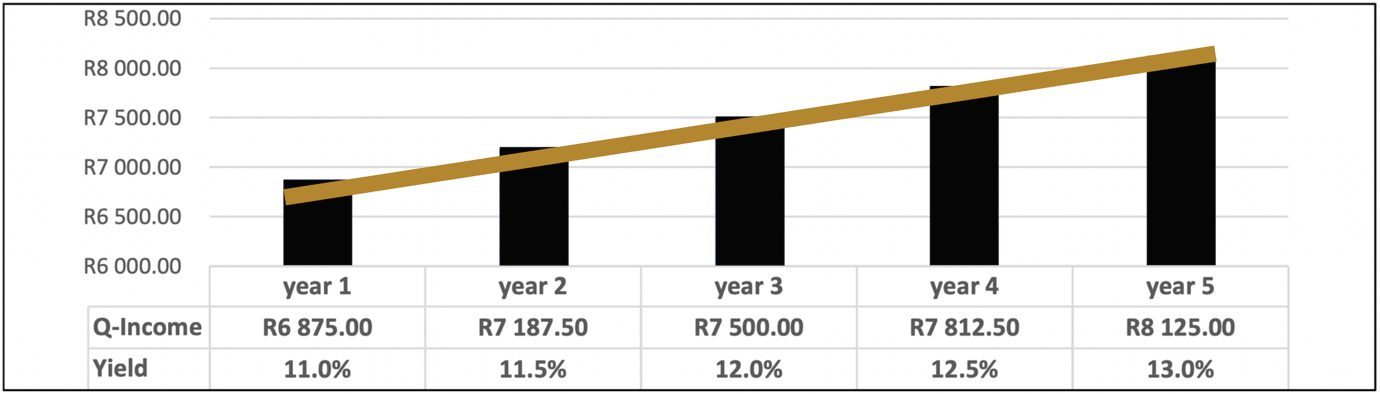 Yield: Flat 11% yield per annum paid quarterly + 0,5% additional increase with every annual anniversary